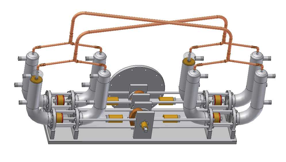Das folgende Bild zeigt ein 3D-Modell der kompletten Maschine. Alle 4 Zylinder sowie die Zylinderköpfe von H1 und K1 sind hier durchsichtig dargestellt, so daß die Kolben und die Düsenplatte in den Zylinderköpfen sichtbar werden. Die externen Wärmetauscher WH1 - WH4 und WK1 - WK4 sind der Übersicht halber weggelassen worden.